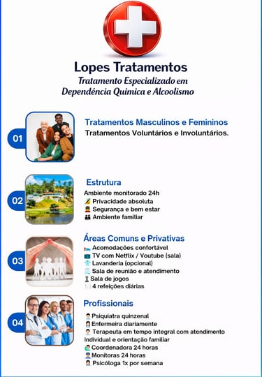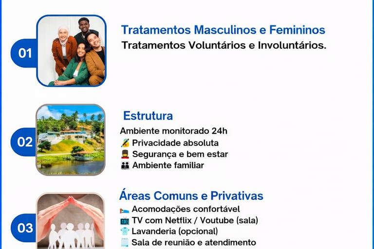 Programa de 12 passos e terapias personalizadas para recuperação.